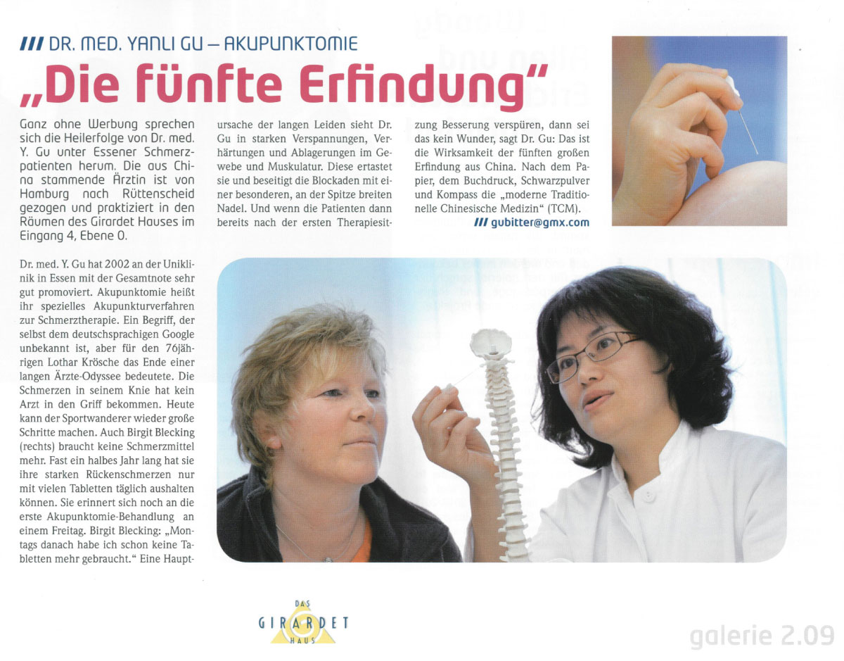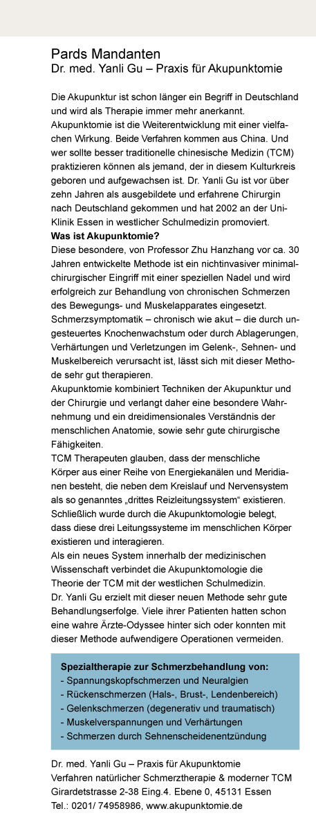 Dr. med. Yanli Gu ist eine der ersten Ärztinen die "Akupunktomie" in Deutschland eingeführt hat. Für ausführliche Information zur Akupunktomie siehe hier: Acupotomology (pdf)